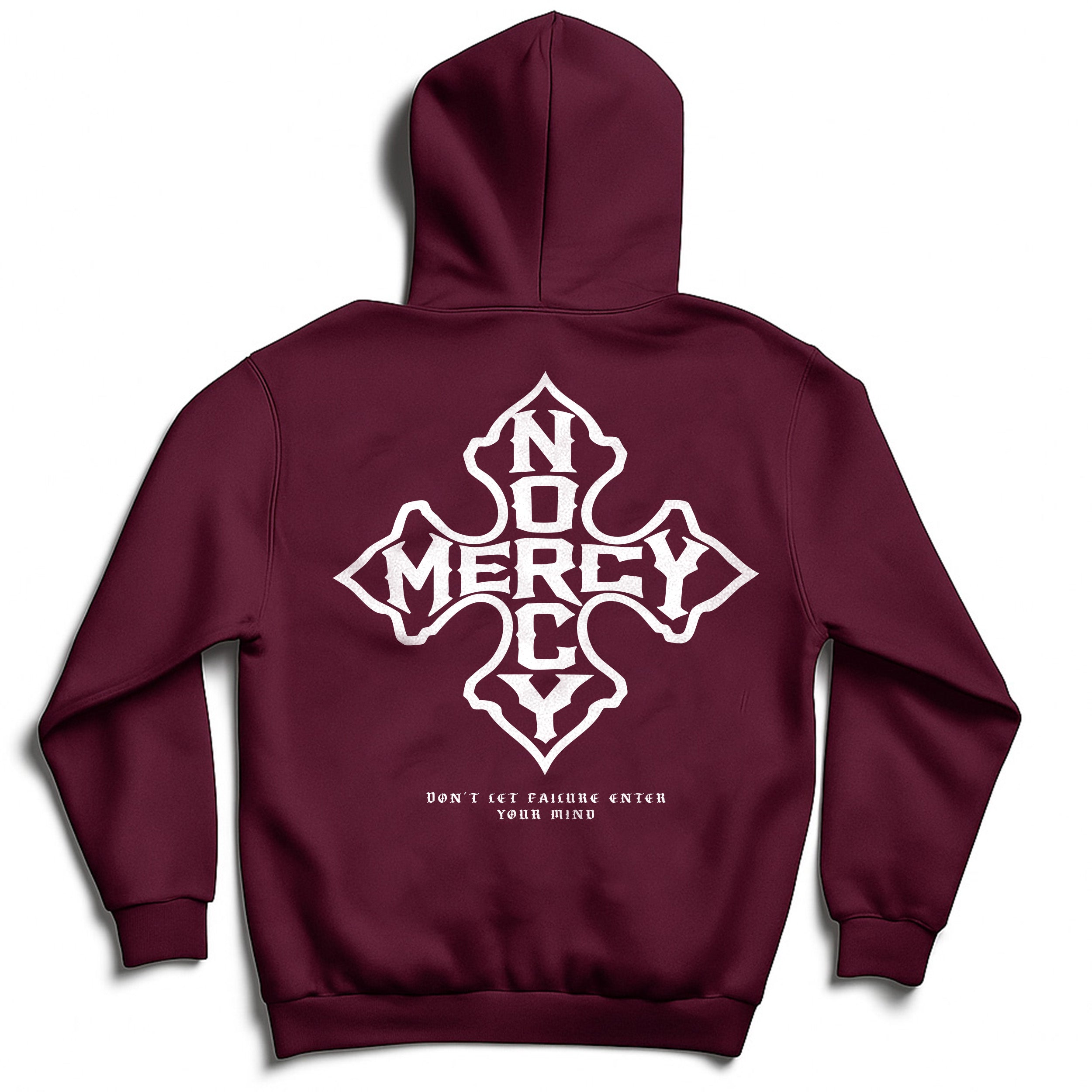 Centered on the back is the bold Iron Cross No Mercy emblem, a powerful symbol of resilience and discipline. Beneath it sits the message: “Don’t Let Failure Enter Your Mind.” A reminder that the real battle happens long before the mat, the gym floor, or the ring — it happens in your head.