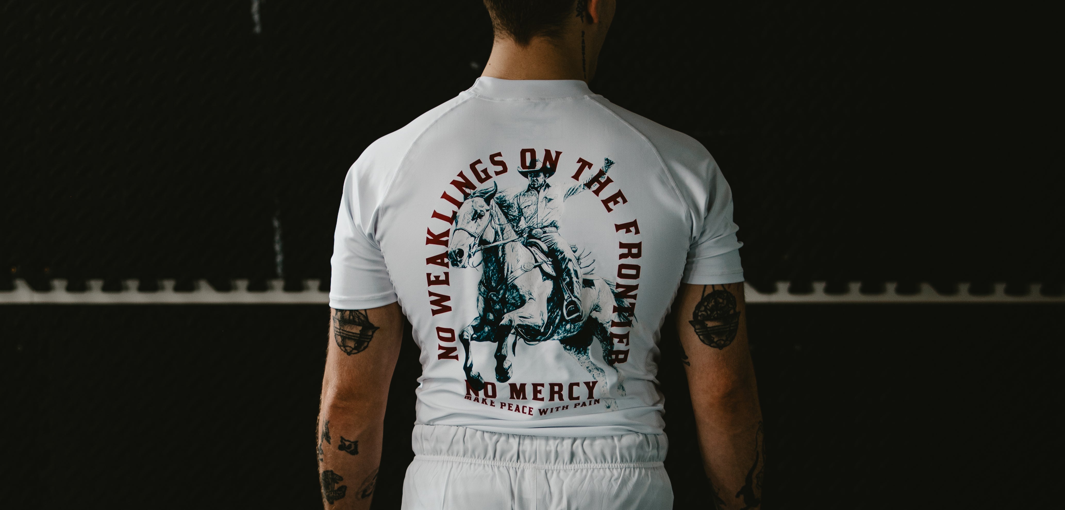 The No Mercy “No Weaklings on the Frontier” Rash Guard is a call to the wild-hearted grappler. Inspired by the raw spirit of the American frontier, this edition captures the clash of survival and skill — where only the relentless ride on.